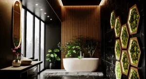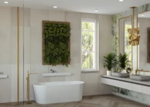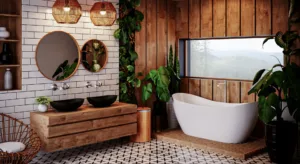Wyjątkowy salon kąpielowy urzeka paletą ziemistych barw, naturalną roślinnością i dużymi oknami, które wpuszczają mnóstwo naturalnego ś...
