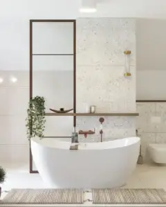 Naturalna, minimalistyczna łazienka a w niej wanna wolnostojąca PRESENA, której wnętrze daje poczucie przyjemnej przestrzeni a uniesion...
