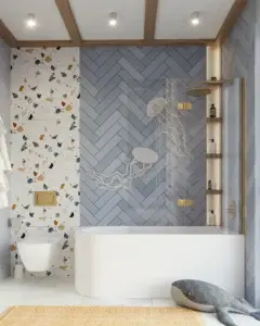 Wyraźne użylenie kamienia stanowi idealne tło dla wanny narożnej UPSALA, wyposażonej w 2-panelowy składany parawan nawannowy JEZIORAK. ...