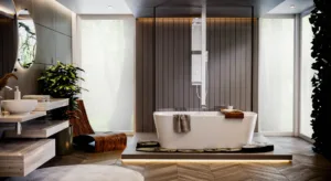 Minimalistyczny projekt salonu kąpielowego, w którym główne skrzypce odgrywa centralnie umieszczona wanna GAULI, zachwyca swoją wszechs...