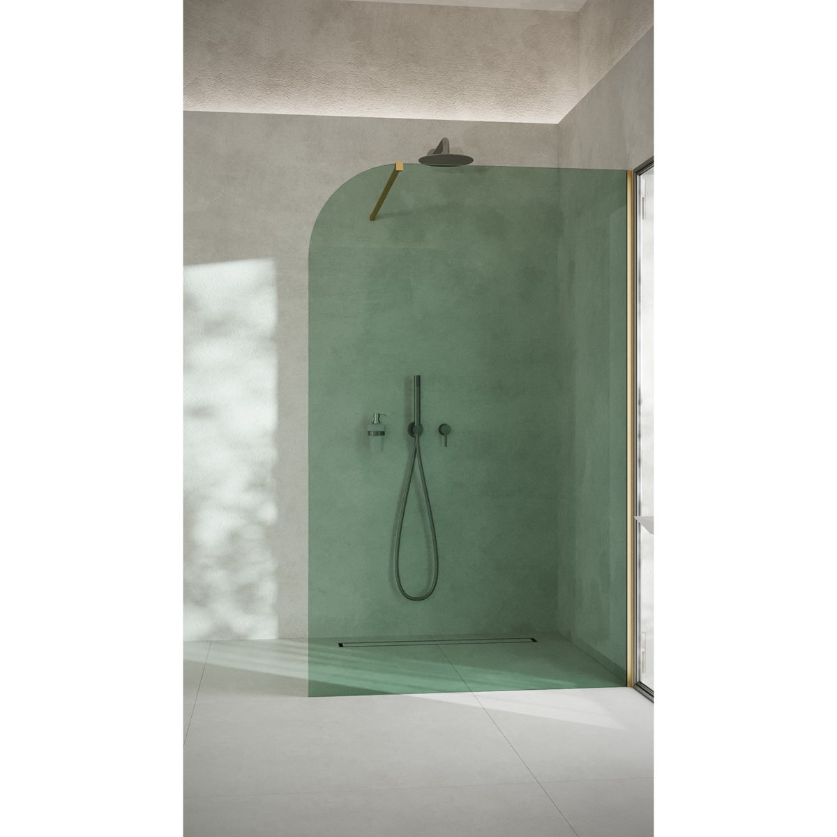 GARDA WALL to przyścienna ścianka prysznicowa z 8 mm hartowanego szkła barwionego w masie, wyróżniająca się jednym elegancko zaokrąglonym rogiem, który łagodzi surową geometrię wnętrza.