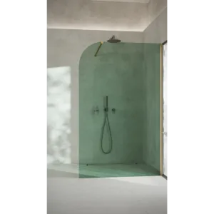 GARDA WALL to przyścienna ścianka prysznicowa z 8 mm hartowanego szkła barwionego w masie, wyróżniająca się jednym elegancko zaokrąglonym rogiem, który łagodzi surową geometrię wnętrza.