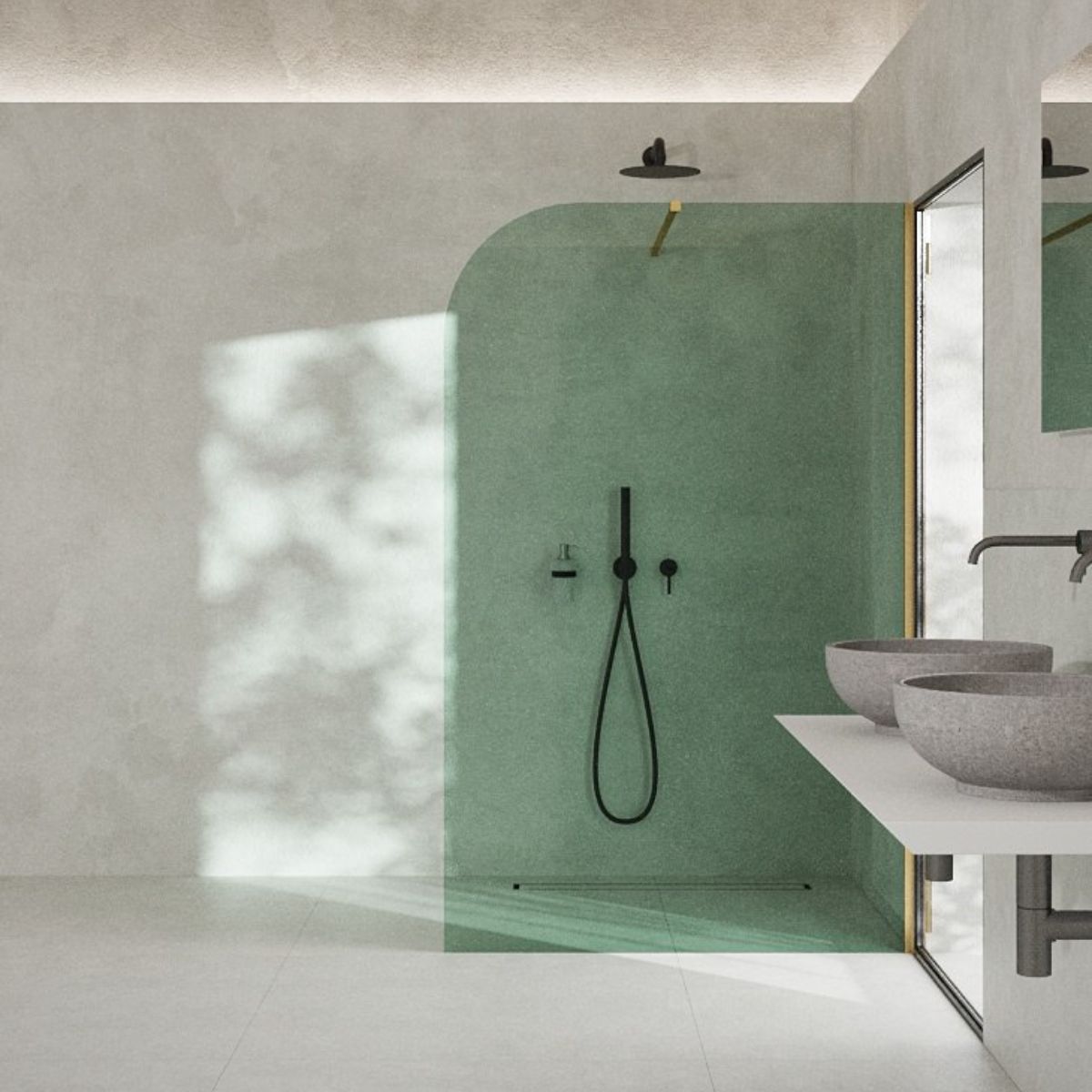 GARDA WALL to przyścienna ścianka prysznicowa z 8 mm hartowanego szkła barwionego w masie, wyróżniająca się jednym elegancko zaokrąglonym rogiem, który łagodzi surową geometrię wnętrza.