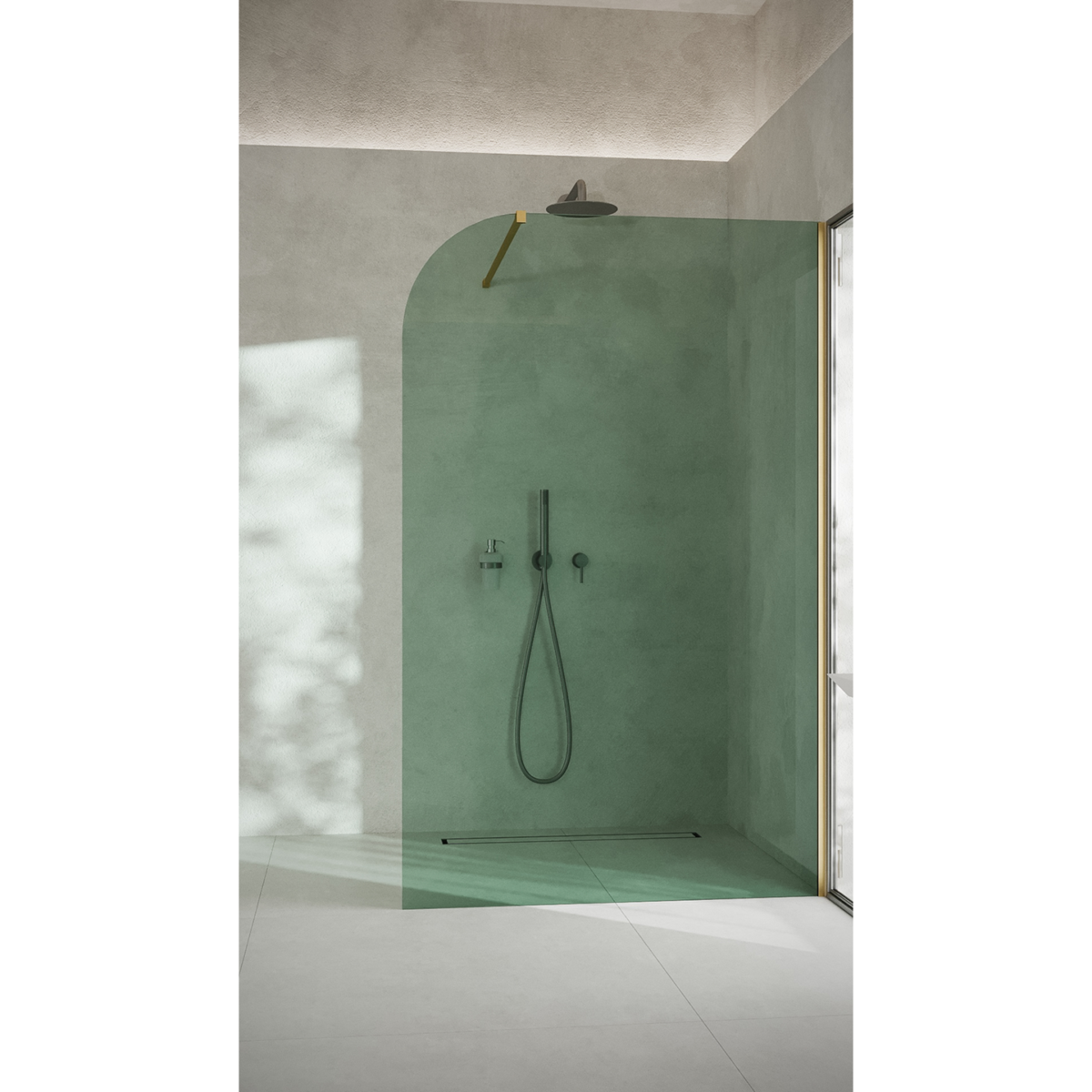 GARDA WALL to przyścienna ścianka prysznicowa z 8 mm hartowanego szkła barwionego w masie, wyróżniająca się jednym elegancko zaokrąglonym rogiem, który łagodzi surową geometrię wnętrza.