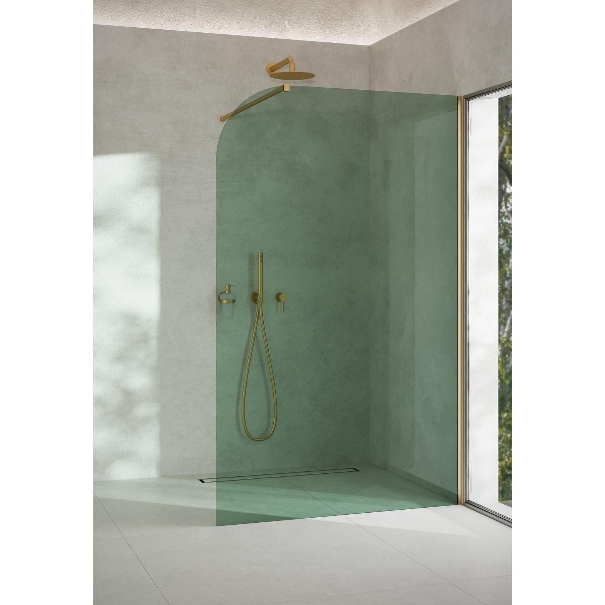 GARDA WALL to przyścienna ścianka prysznicowa z 8 mm hartowanego szkła barwionego w masie, wyróżniająca się jednym elegancko zaokrąglonym rogiem, który łagodzi surową geometrię wnętrza.