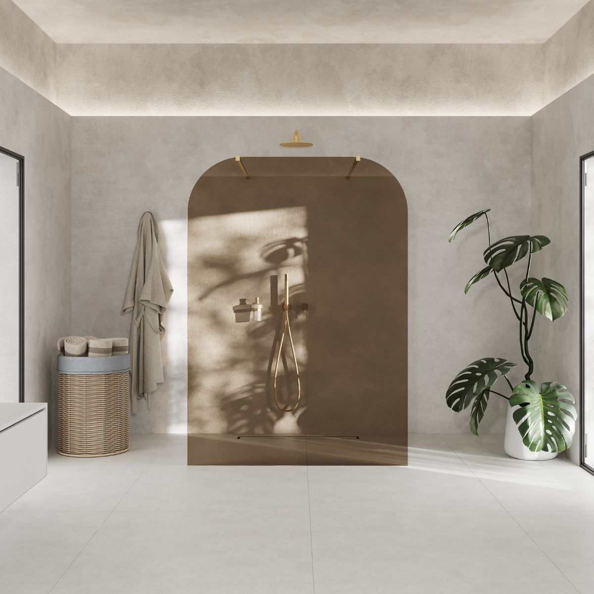 Geometryczne i zarazem miękkie. Dwa łagodne zaokrąglenia naroży sprawiają, że ścianka staje się niemal rzeźbą światła i koloru. Ten subtelny detal wpisuje się w trendy soft-minimalism i japandi, nadając łazience poczucie harmonii i przytulności.