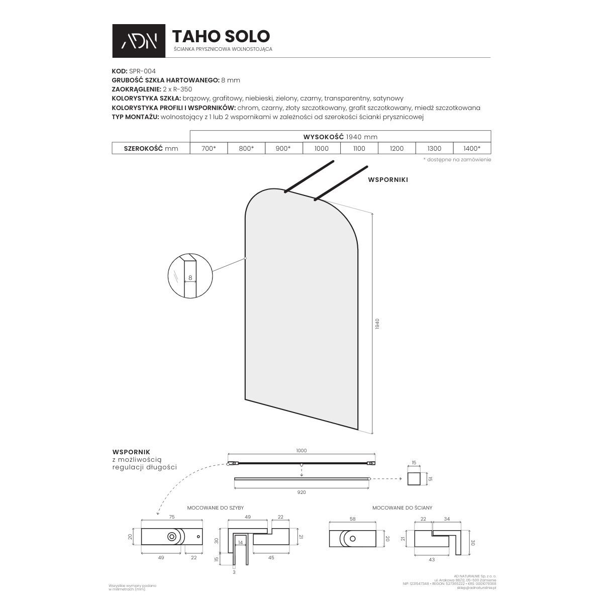 - Grubość szkła: 8 mm (hartowane)