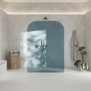 Geometryczne i zarazem miękkie. Dwa łagodne zaokrąglenia naroży sprawiają, że ścianka staje się niemal rzeźbą światła i koloru. Ten subtelny detal wpisuje się w trendy soft-minimalism i japandi, nadając łazience poczucie harmonii i przytulności.