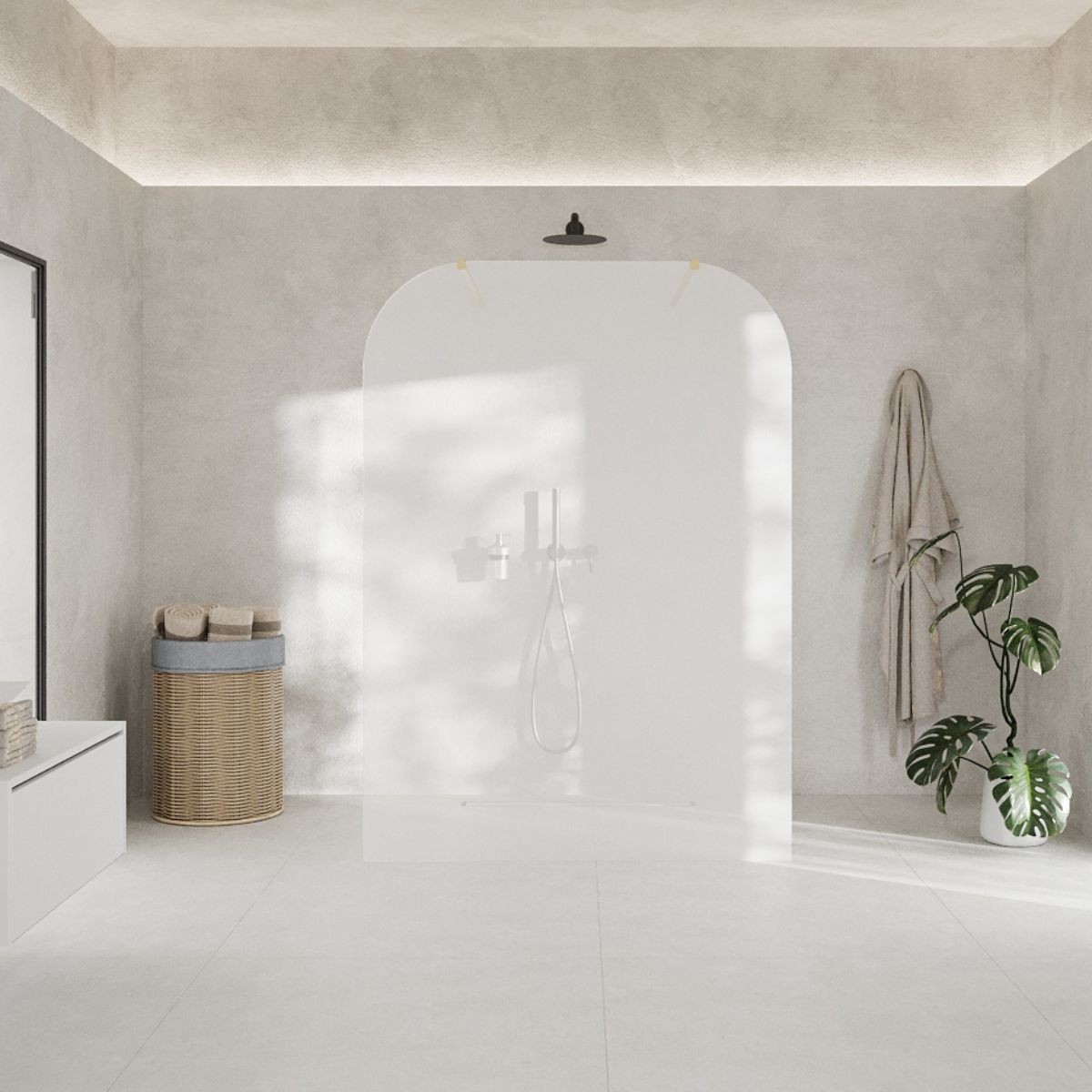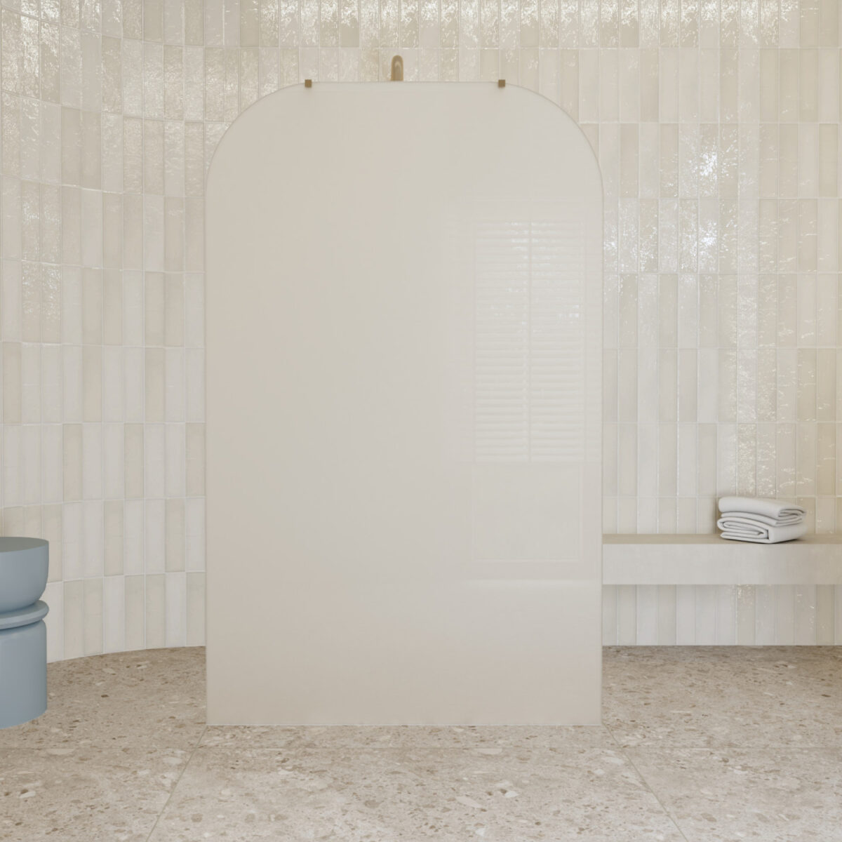 Geometryczne i zarazem miękkie. Dwa łagodne zaokrąglenia naroży sprawiają, że ścianka staje się niemal rzeźbą światła i koloru. Ten subtelny detal wpisuje się w trendy soft-minimalism i japandi, nadając łazience poczucie harmonii i przytulności.