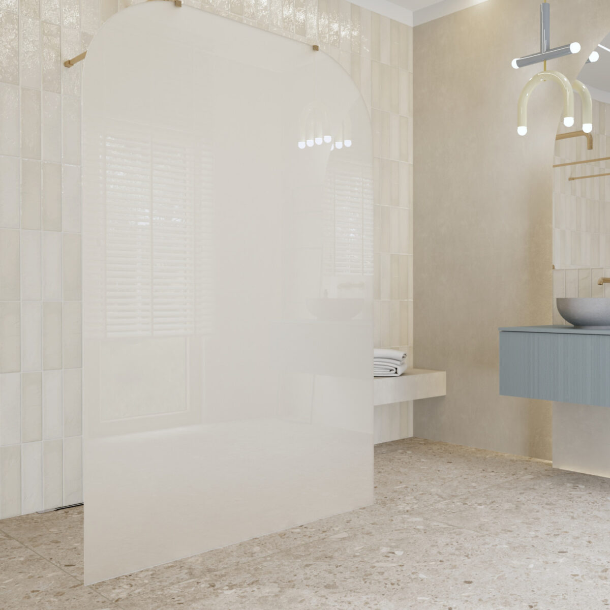 Geometryczne i zarazem miękkie. Dwa łagodne zaokrąglenia naroży sprawiają, że ścianka staje się niemal rzeźbą światła i koloru. Ten subtelny detal wpisuje się w trendy soft-minimalism i japandi, nadając łazience poczucie harmonii i przytulności.