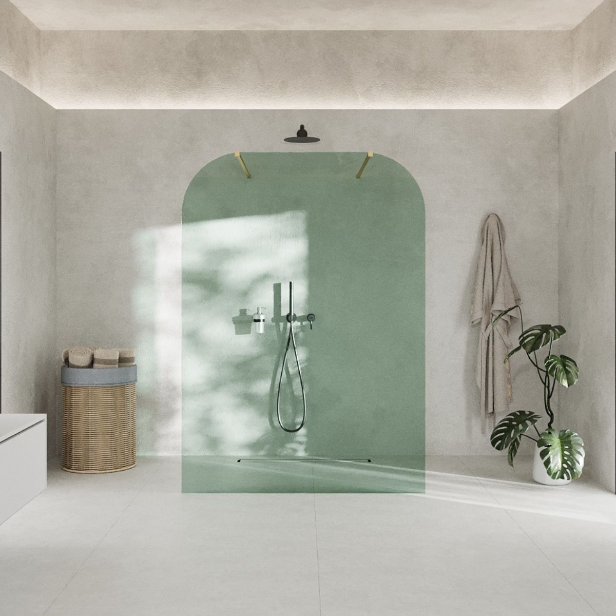 Geometryczne i zarazem miękkie. Dwa łagodne zaokrąglenia naroży sprawiają, że ścianka staje się niemal rzeźbą światła i koloru. Ten subtelny detal wpisuje się w trendy soft-minimalism i japandi, nadając łazience poczucie harmonii i przytulności.