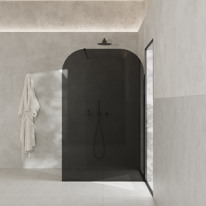 TAHO WALL to elegancka, przyścienna ścianka prysznicowa z hartowanego 8 mm szkła barwionego w masie, z dwoma subtelnie zaokrąglonymi narożnikami, które łagodzą formę i podkreślają lekkość designu. Montowana dłuższym bokiem do ściany, na posadzce lub brodziku – zapewnia maksymalną stabilność i swobodę aranżacji wnętrza.