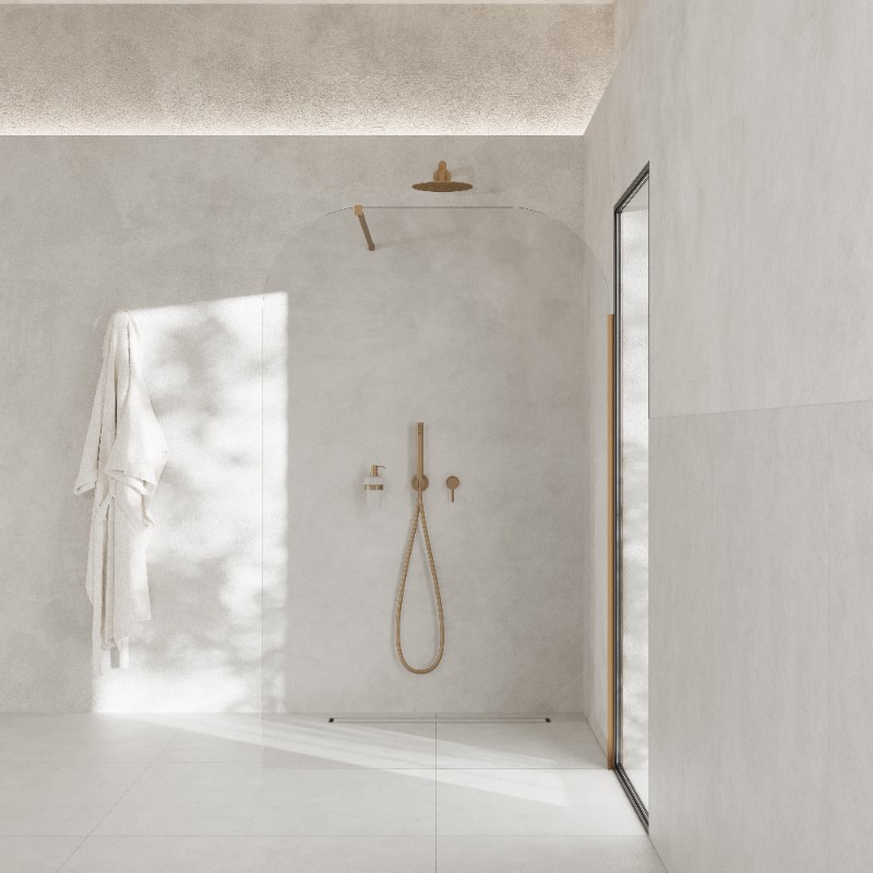 TAHO WALL to elegancka, przyścienna ścianka prysznicowa z hartowanego 8 mm szkła barwionego w masie, z dwoma subtelnie zaokrąglonymi narożnikami, które łagodzą formę i podkreślają lekkość designu. Montowana dłuższym bokiem do ściany, na posadzce lub brodziku – zapewnia maksymalną stabilność i swobodę aranżacji wnętrza.