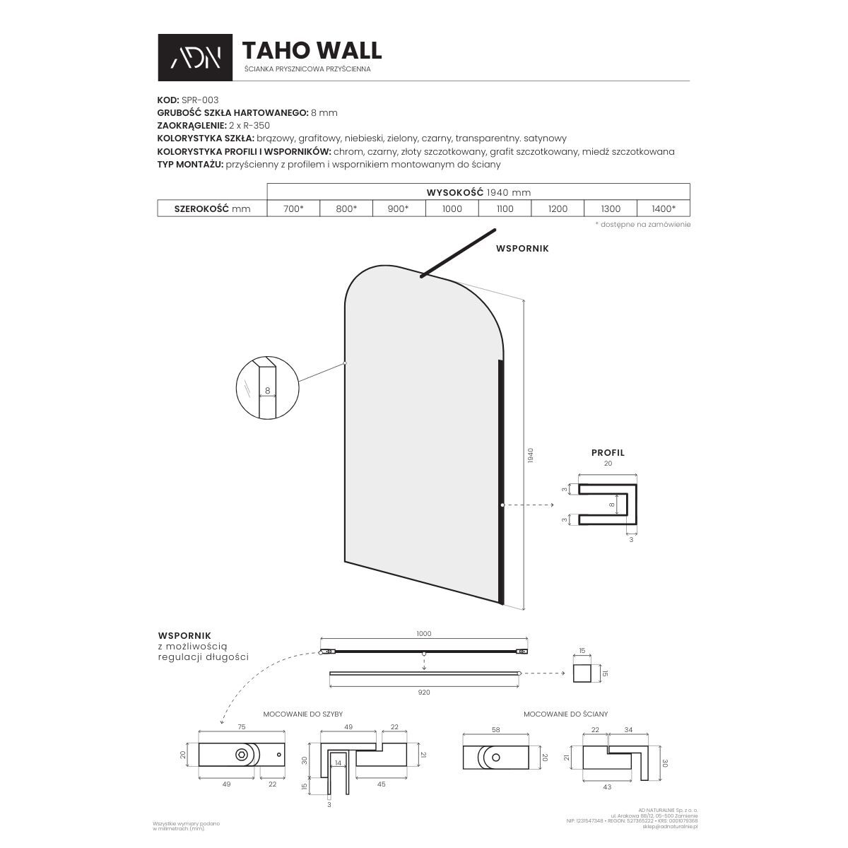 - Personalizacja – 7 kolorów, 3 kolory wykończenia profili i wsporników, regulowany wspornik.