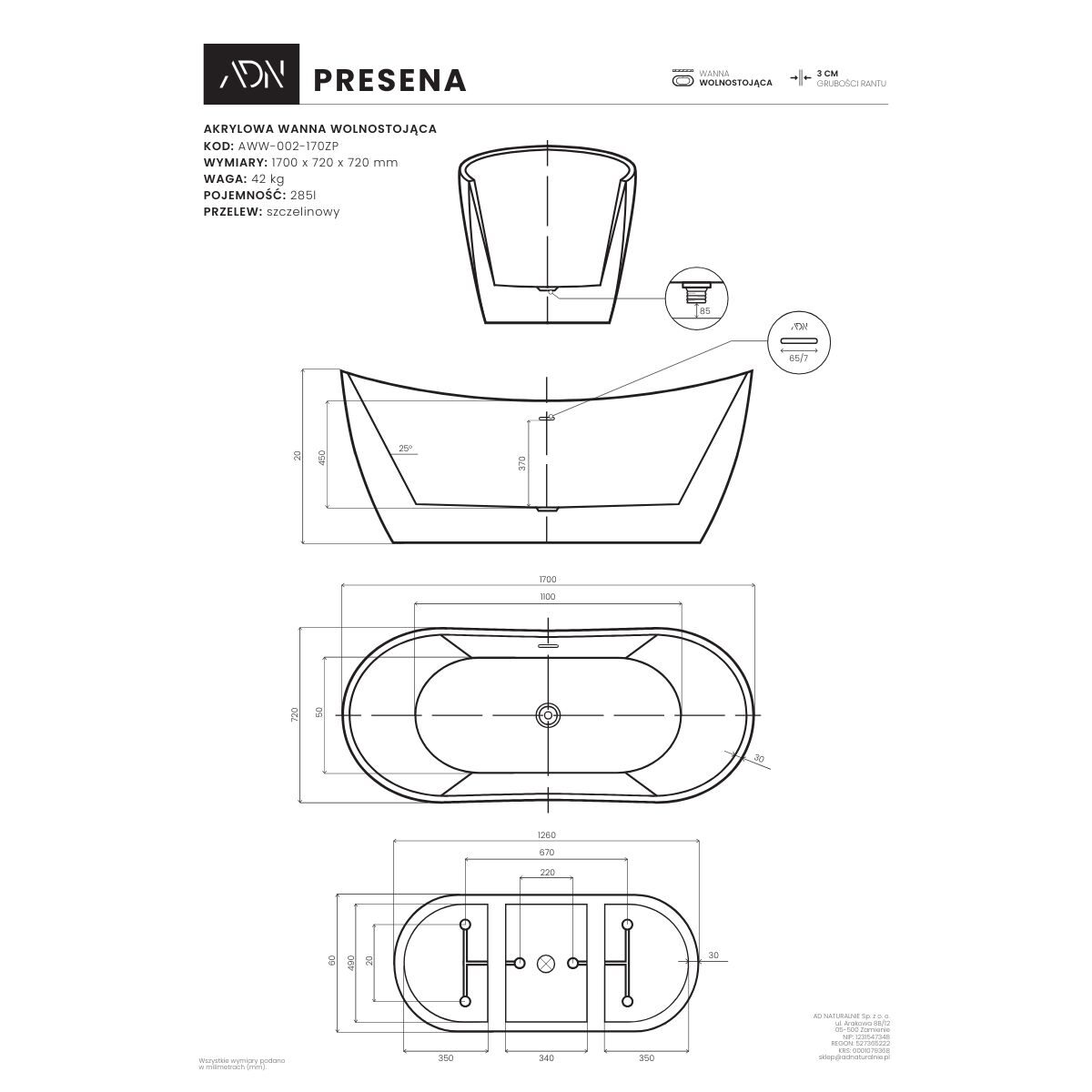 Gładka, starannie wykończona powierzchnia akrylowa, wzmocniony stelaż i ruchome nóżki sprawiają, że PRESENA stanie się stylową ozdobą Twojej łazienki oraz idealnym miejscem do wieczornego relaksu.
