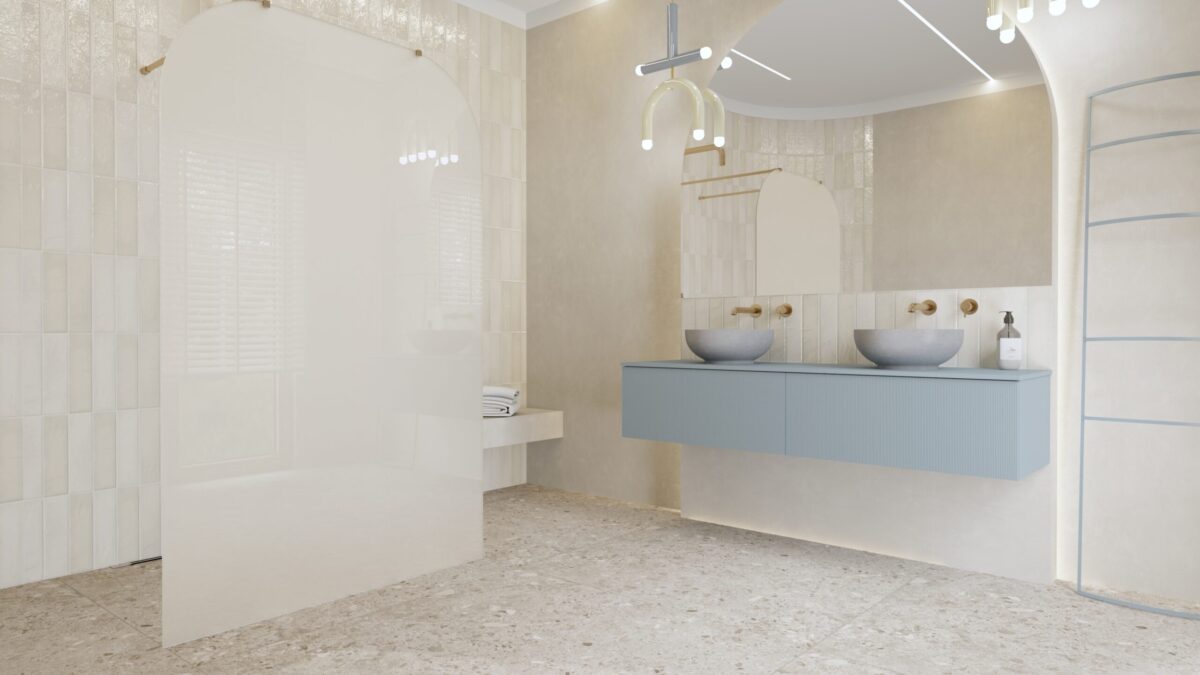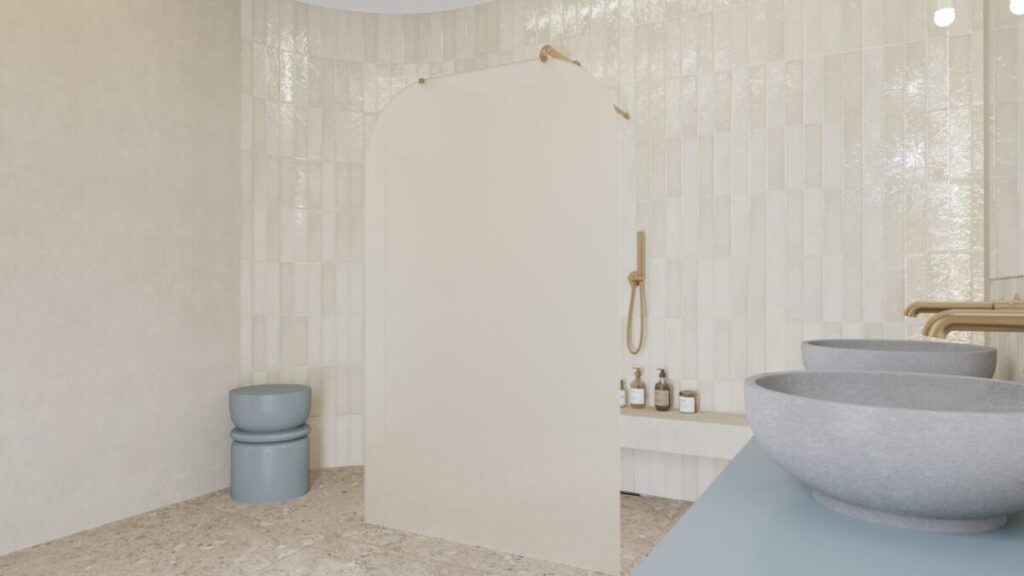 Geometryczne i zarazem miękkie. Dwa łagodne zaokrąglenia naroży sprawiają, że ścianka staje się niemal rzeźbą światła i koloru. Ten subtelny detal wpisuje się w trendy soft-minimalism i japandi, nadając łazience poczucie harmonii i przytulności.